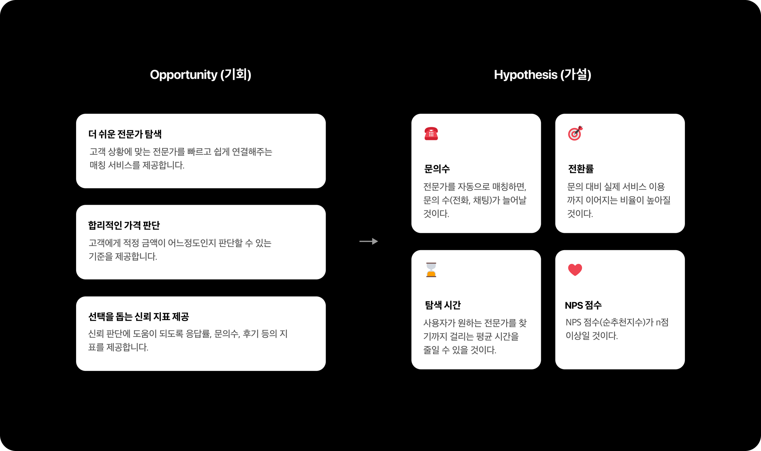 사용자 여정에서 발견한 문제를 기반으로, 해결할 수 있는 기회와 검증 가능한 가설을 도출했습니다.