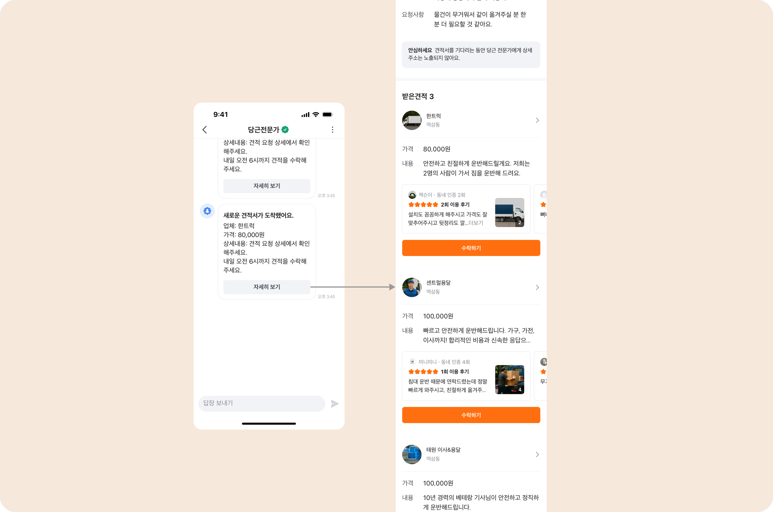 사용자는 자동 매칭 또는 직접 선택을 통해, 한 번의 견적 요청만으로 전문가를 찾을 수 있습니다.