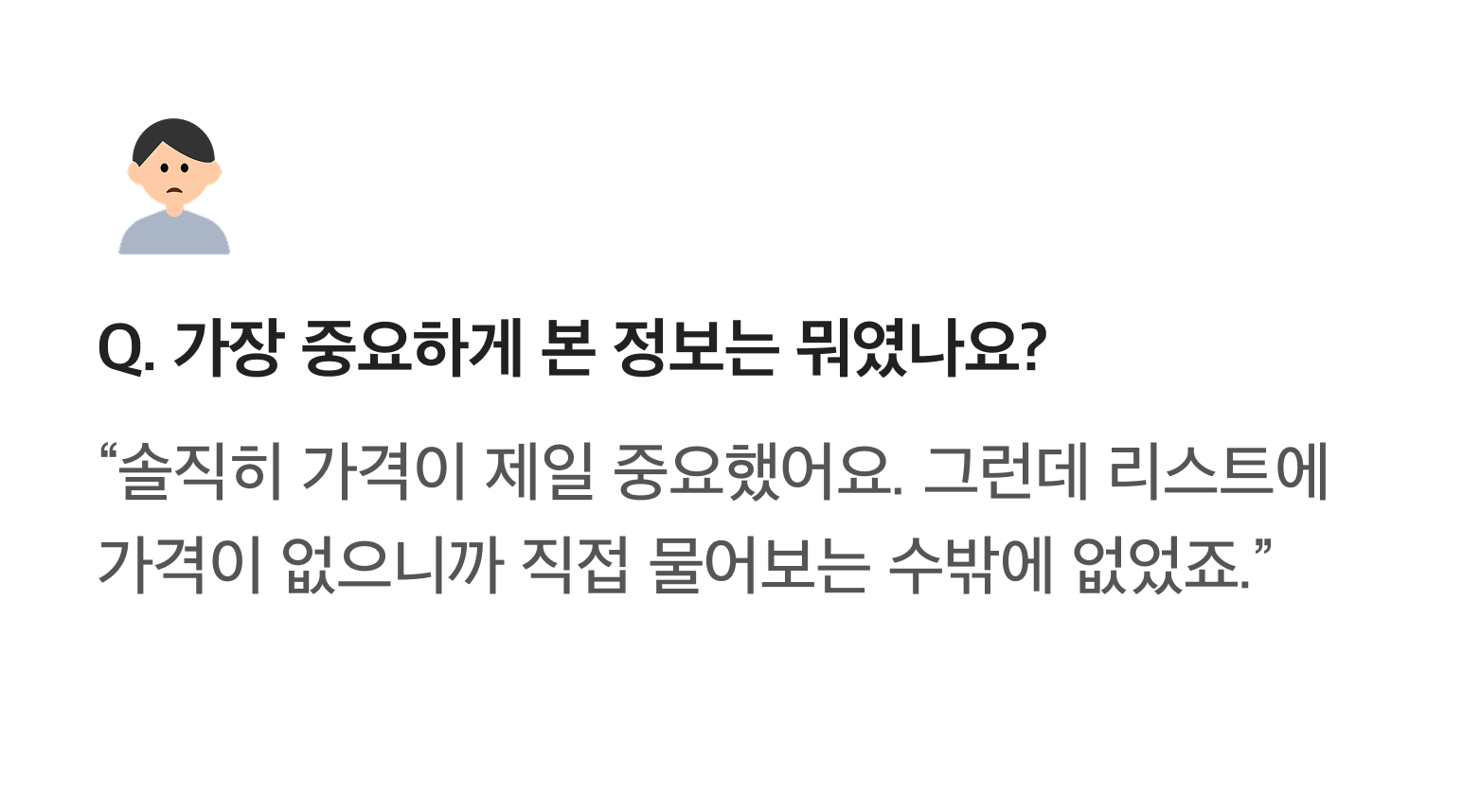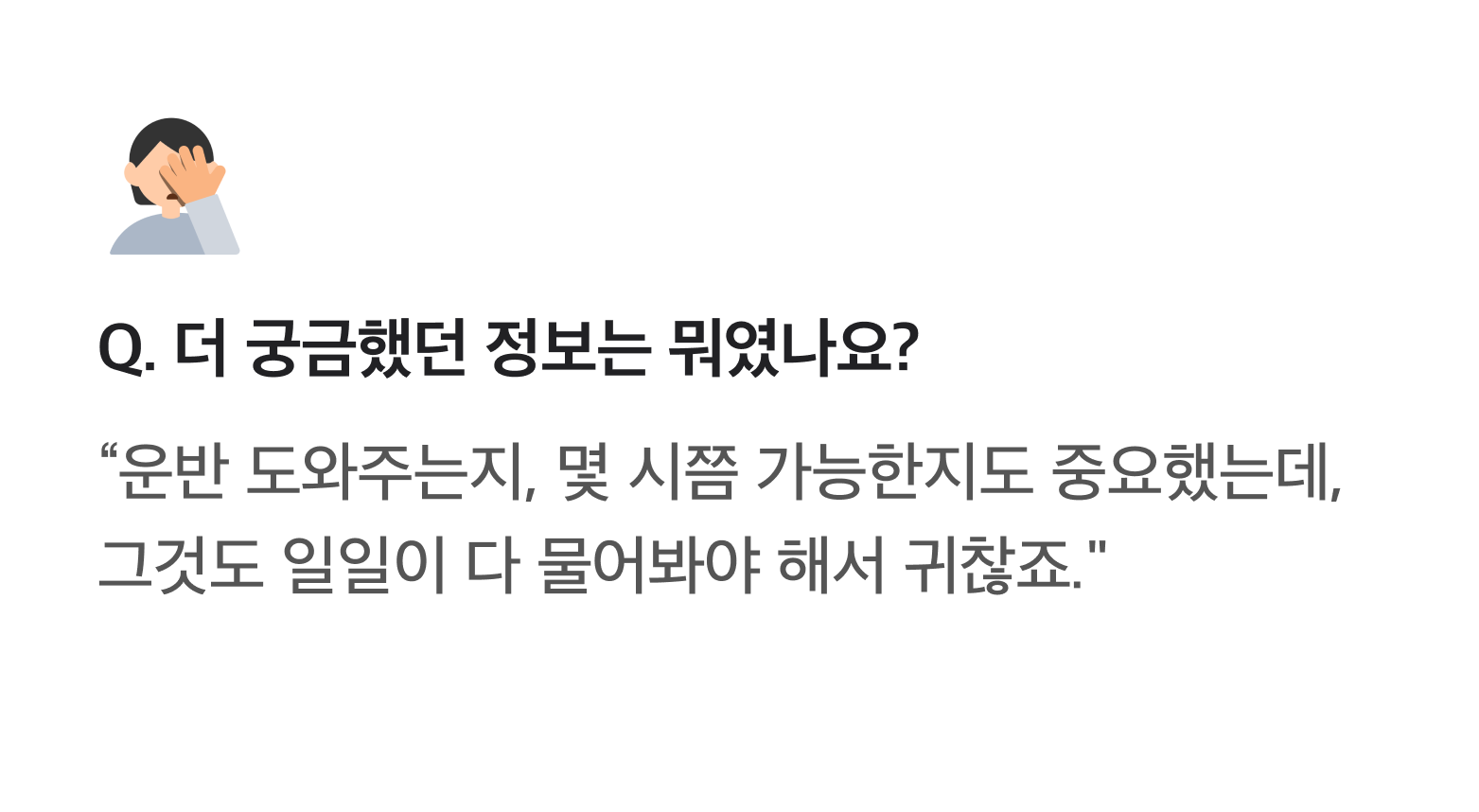 또한, 각기 다른 용달 업체에 두 번 이상 가격 문의를 보낸 사용자 비율이 n%*에 달했습니다. 이는 사용자가 특정 정보를 얻고자 하는 니즈가 분명함에도, 해당 정보를 쉽게 확인하기 어려워 동일한 질문을 반복적으로 보내야 하는 상황이 발생하고 있으며, 이러한 반복 과정이 사용자에게 비효율적이고 피로한 경험으로 이어졌을 가능성을 예상해볼 수 있었습니다.