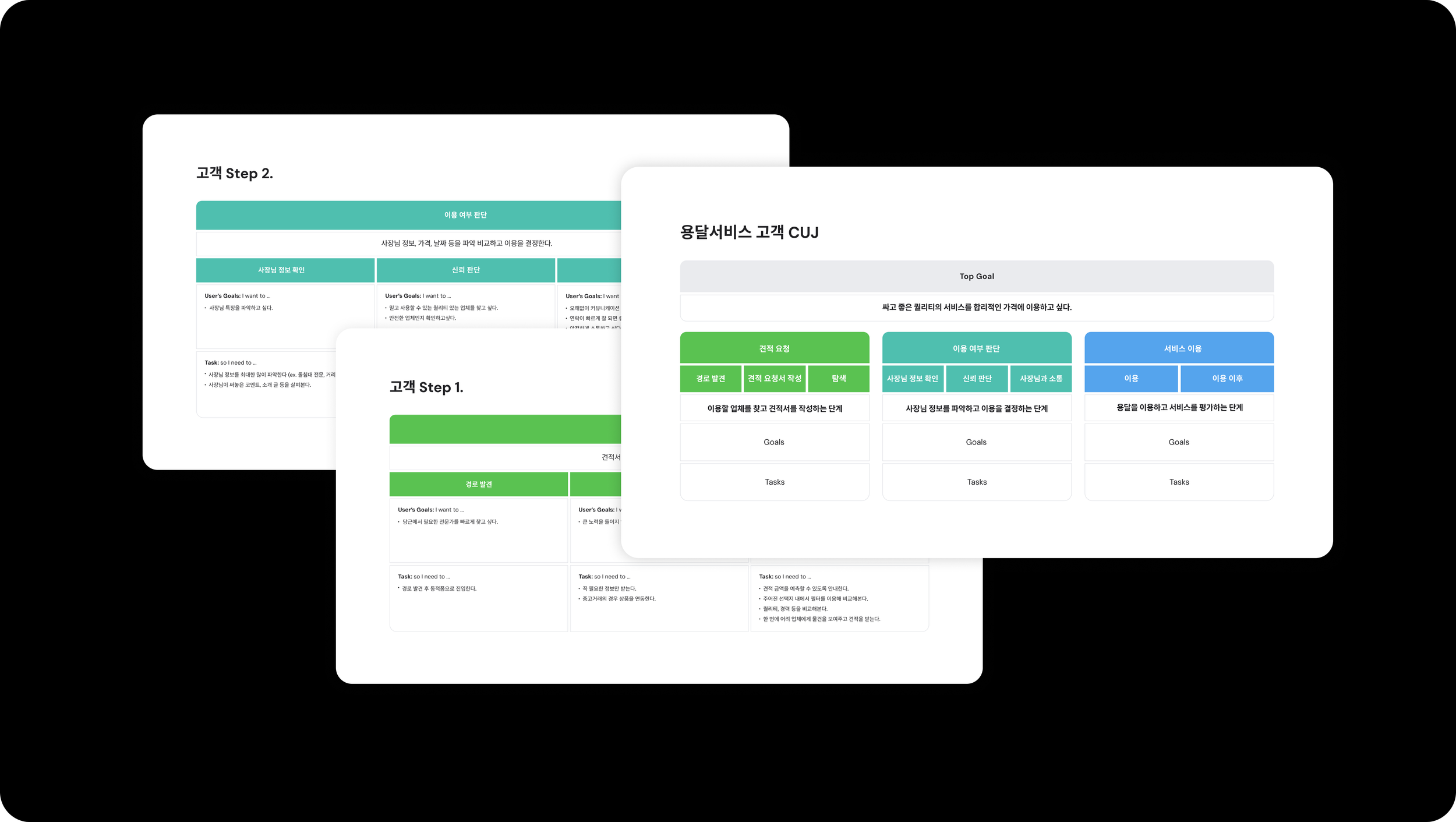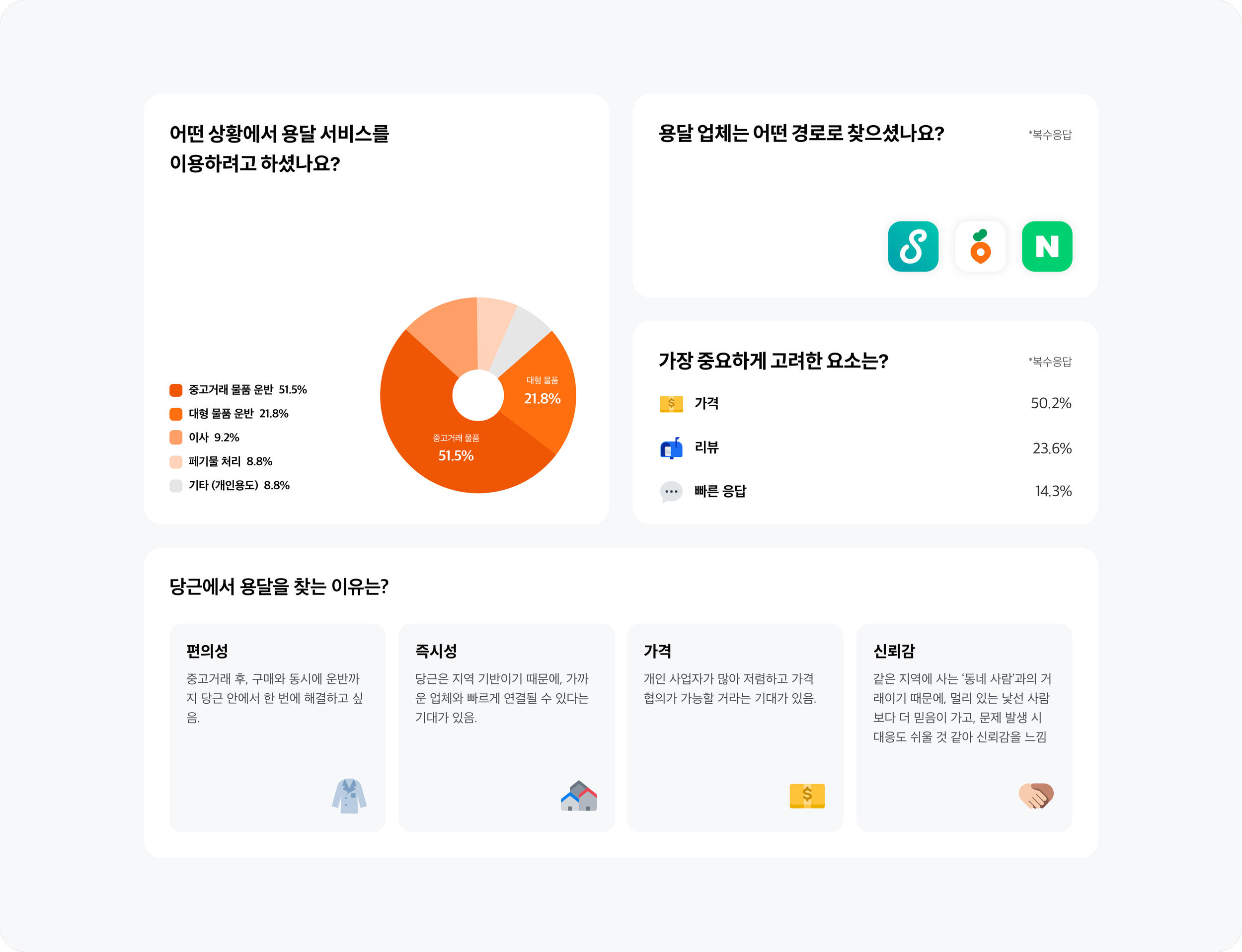 유저 리서치를 바탕으로, 용달 서비스를 찾고 이용하는 과정에서의 핵심 문제를 정리했습니다.