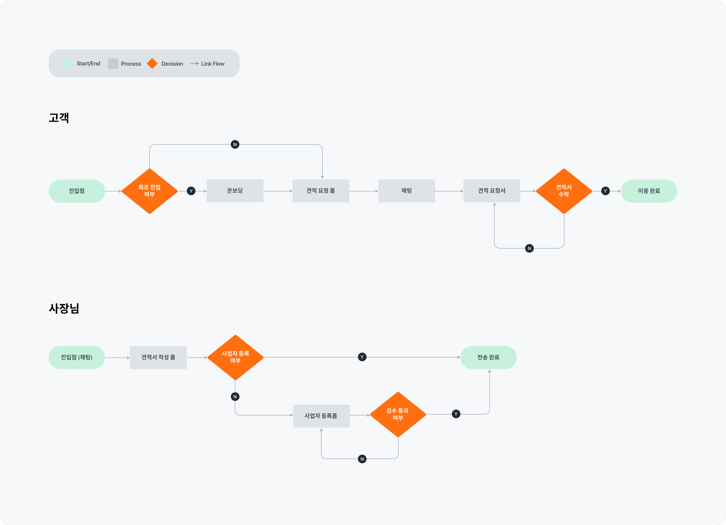 사용자가 원하는 목표를 가장 빠르고 직관적으로 달성할 수 있도록 흐름을 그렸습니다.