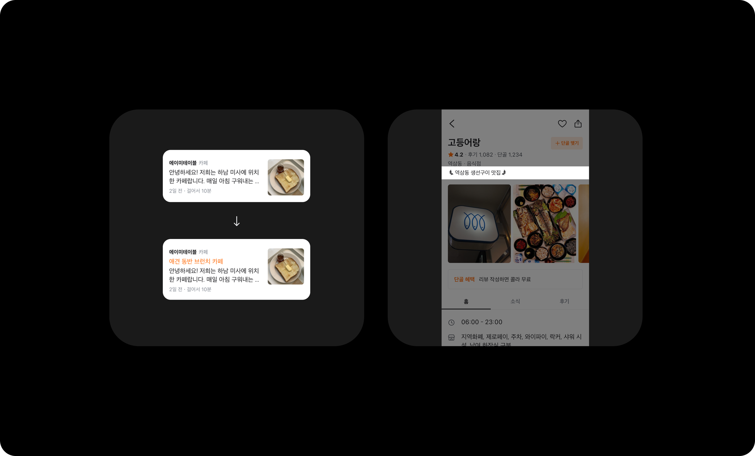 LLM 이용하여 동네 업체 소개와 리뷰를 기반으로 요약문과 해시태그를 생성합니다. 유저는 리뷰를 직접 읽어보지 않더라도 한 눈에 업체를 파악할 수 있습니다.
