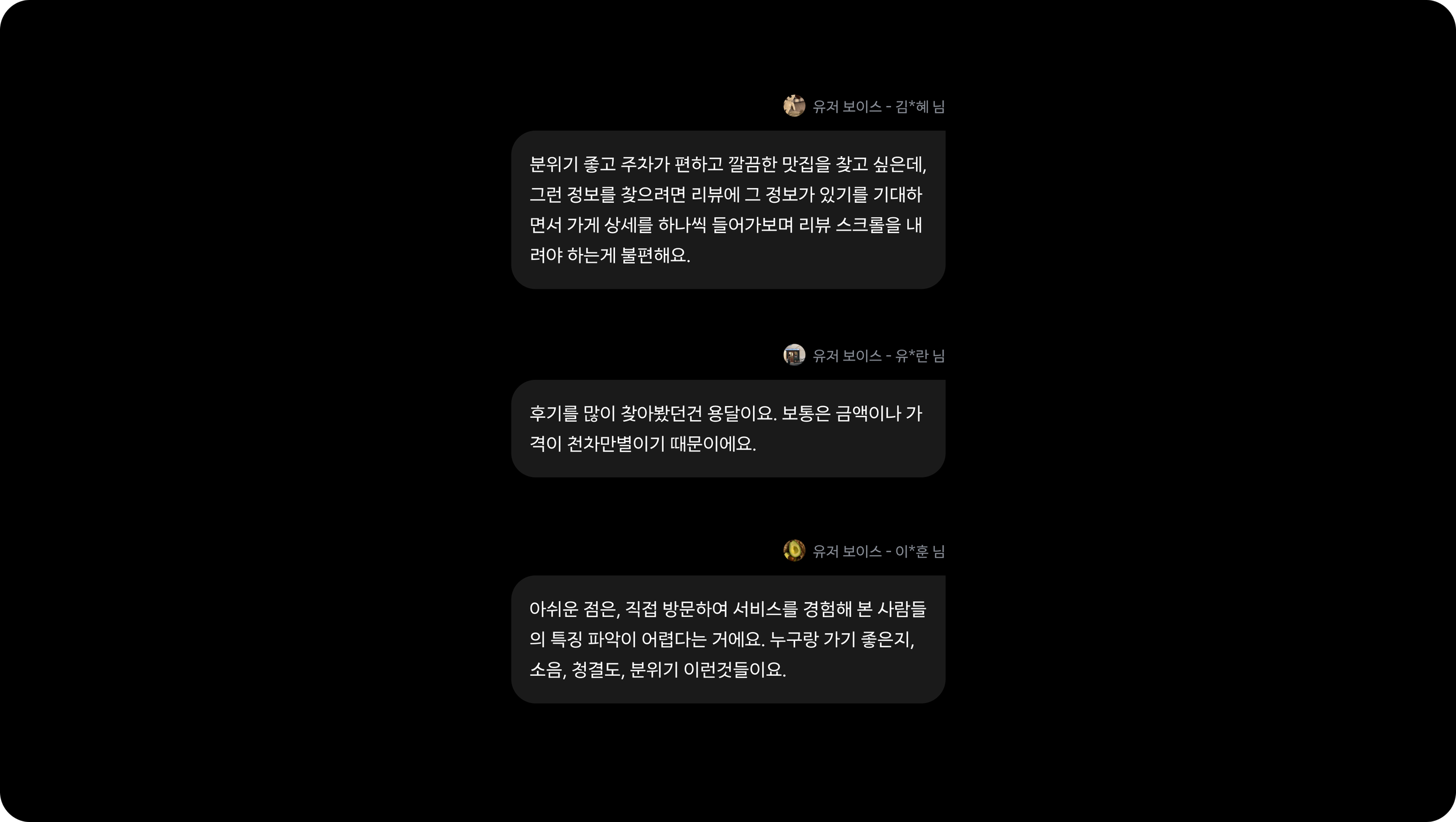유저는 후기에서 어떤 정보를 알고 싶어 할까요? 사장님이 제공하는 공식적인 정보와 실제 사용자의 경험 기반 정보는 다릅니다.