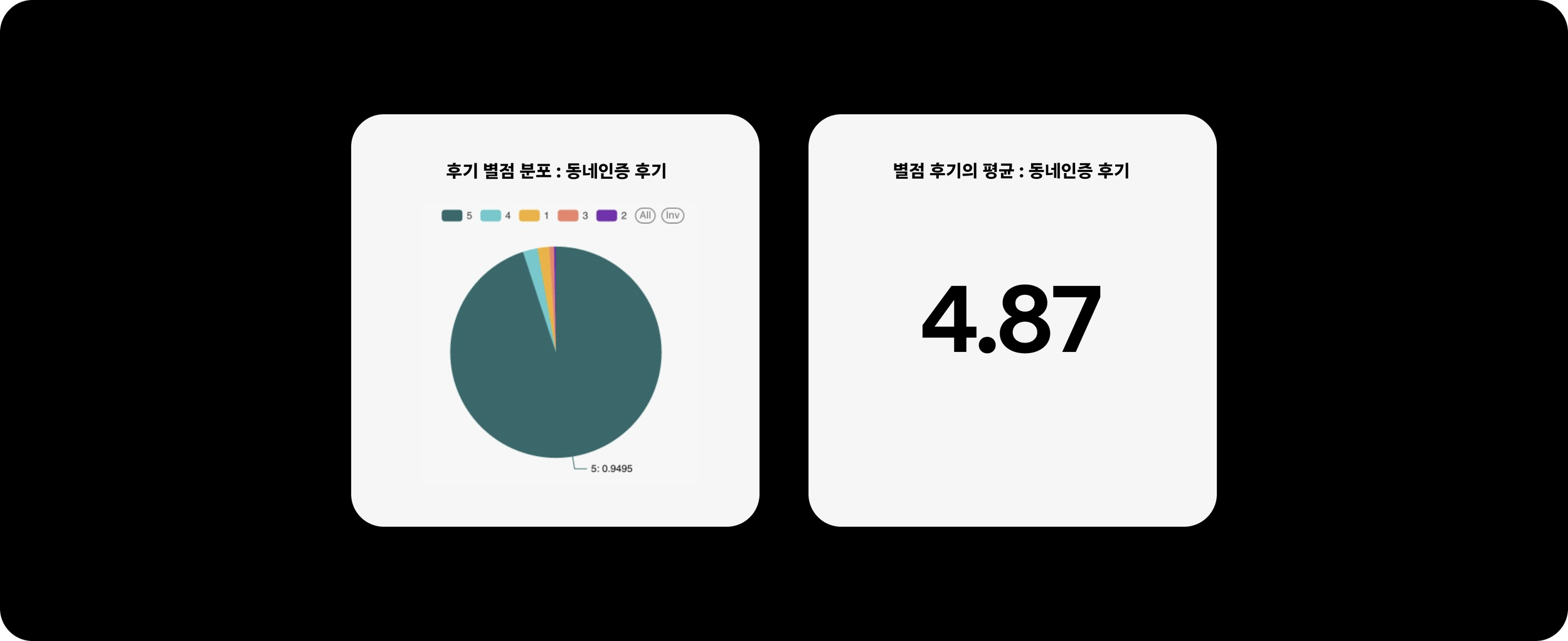 실제 동네 인증이 된 유저의 후기 평점은 4.87점, 5점 후기는 94%로 과대평가 되어 있습니다. 점수를 유저가 직접 매기니 가게에 피해가 갈까봐, 부담스러워서 그 이하의 별점을 꺼리는 양상도 확인할 수 있었습니다.