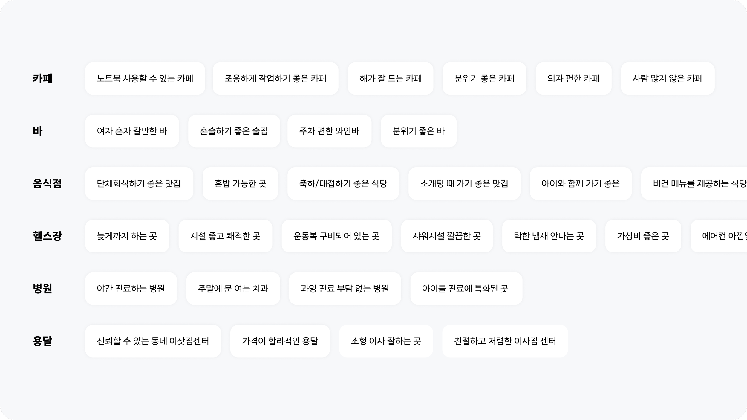 이런 후기를 분석하여 이러한 특성을 다양한 노출 구좌 (비즈프로필 리스트 화면의 필터, 특정 특성이 많이 언급된 비즈프로필만 모아주는 큐레이션 등)에 적용할 수 있다면, 사용자가 원하는 장소나 전문가를 탐색하는 데 유용할 것이다는 가설을 세웠습니다.