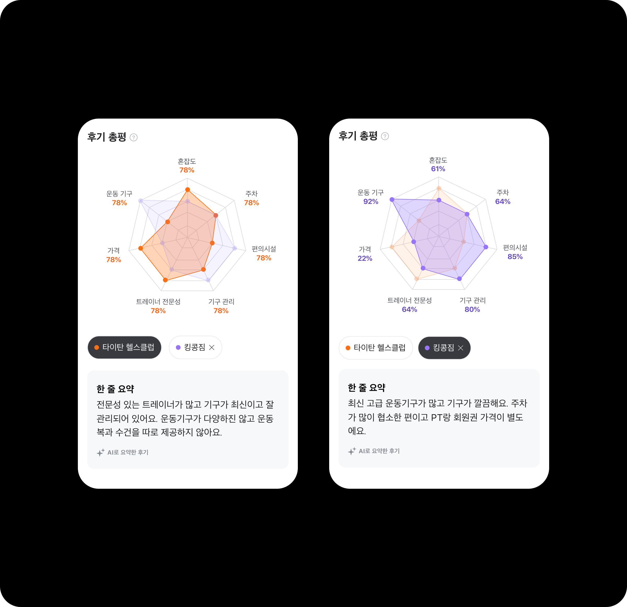 예시: A 피트니스센터는 시설이 뛰어나지만 가격이 높고, B 피트니스센터는 트레이너 평점이 높지만 시설이 부족한 경우, 이를 직관적으로 비교 가능