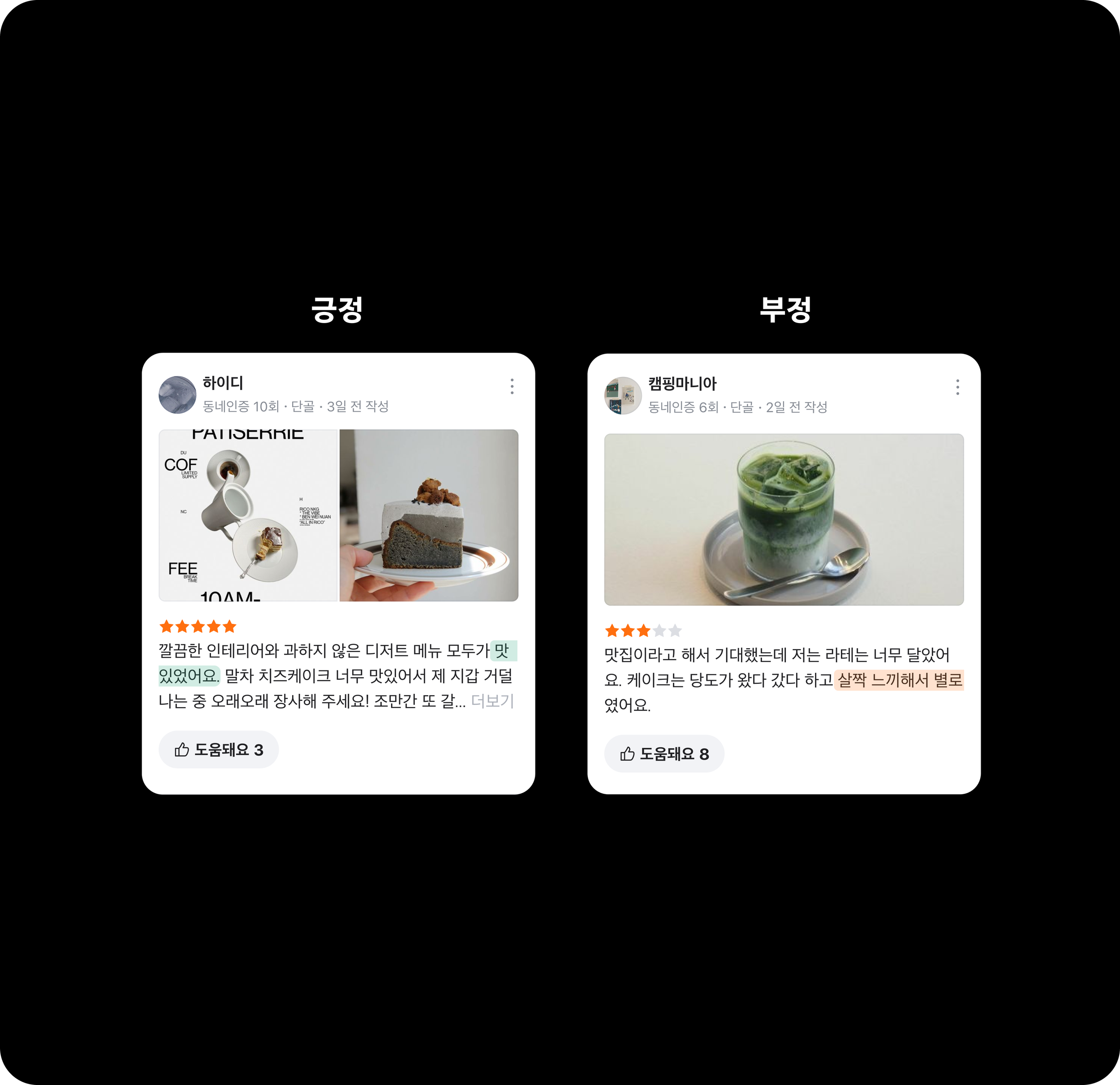 실제 유저들의 생생한 경험담을 그대로 전달하면서, 원하는 정보를 쉽게 찾을 수 있도록 하이라이트 기능을 제공합니다. 후기에서 특정 키워드가 언급되었는지 확인하고, 긍정/부정 여부에 따라 강조하여 보여줍니다.