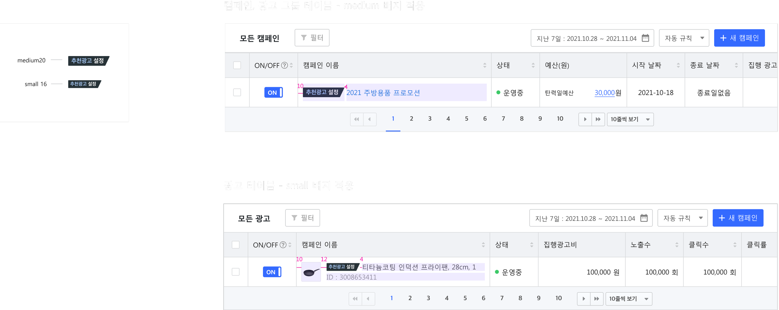 대시보드 상단 배너 영역을 이용해 광고 담당자가 추천할 광고를 시각적으로 나누었습니다.