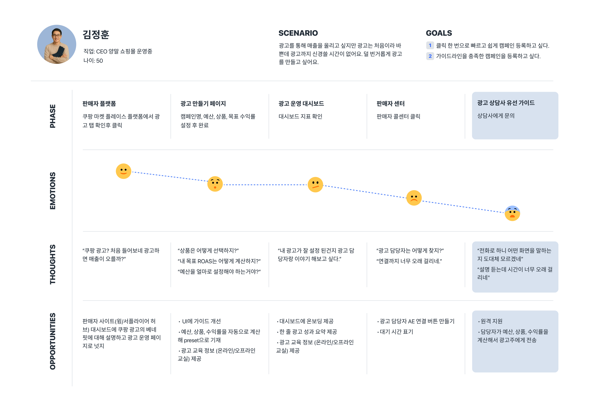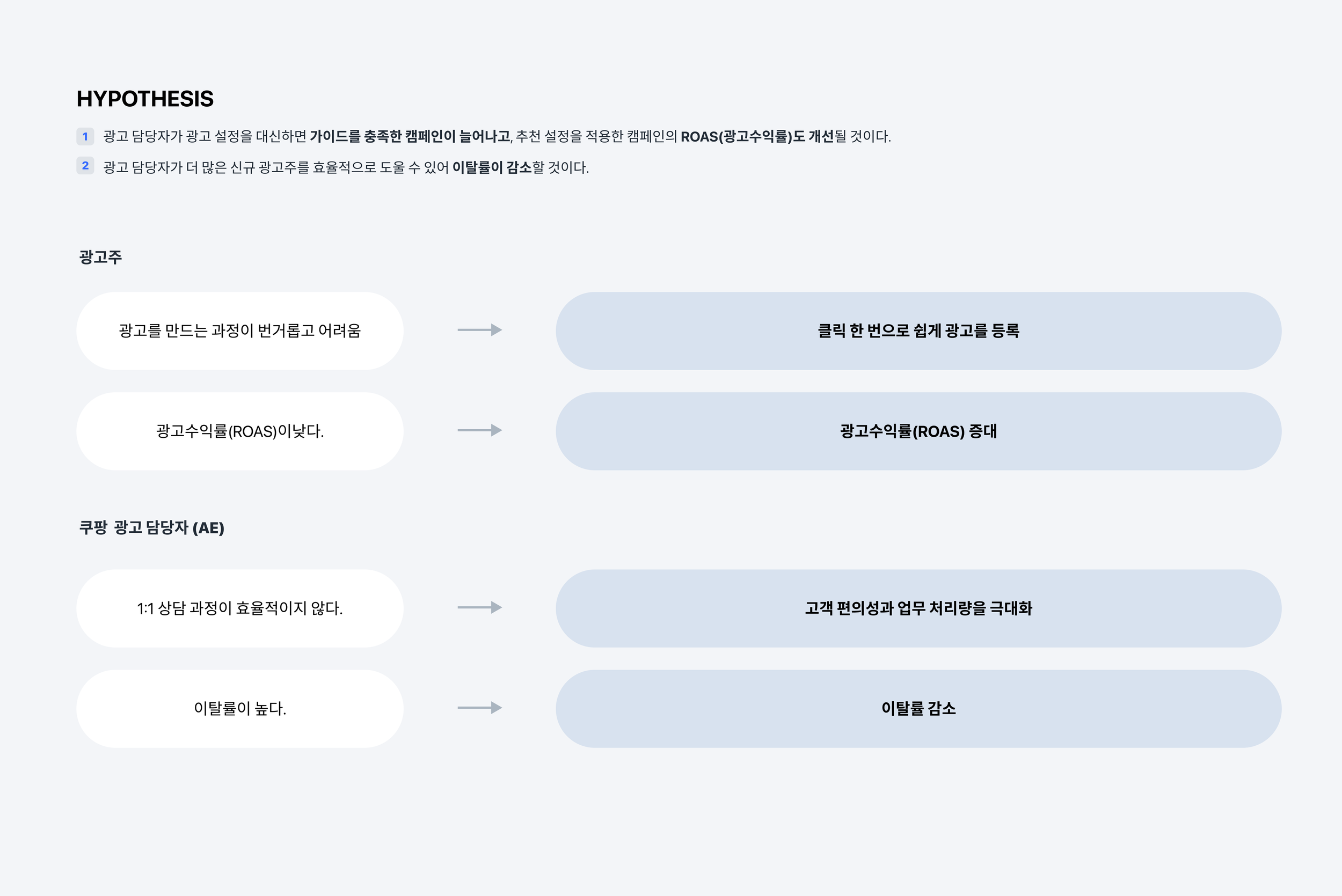신규 광고주의 전반적인 플랫폼 온보딩과 광고 세팅을 돕기 위해 쿠팡 광고 AE (클라이언트와의 커뮤니케이션은 물론이고 광고 솔루션 제안부터 집행, 결과 산출까지 도맡아 함)가 유선으로 광고 설정을 도왔으나, 그 과정에서 시간과 비용이 많이 들고 있다는 내부 피드백이 있었습니다.