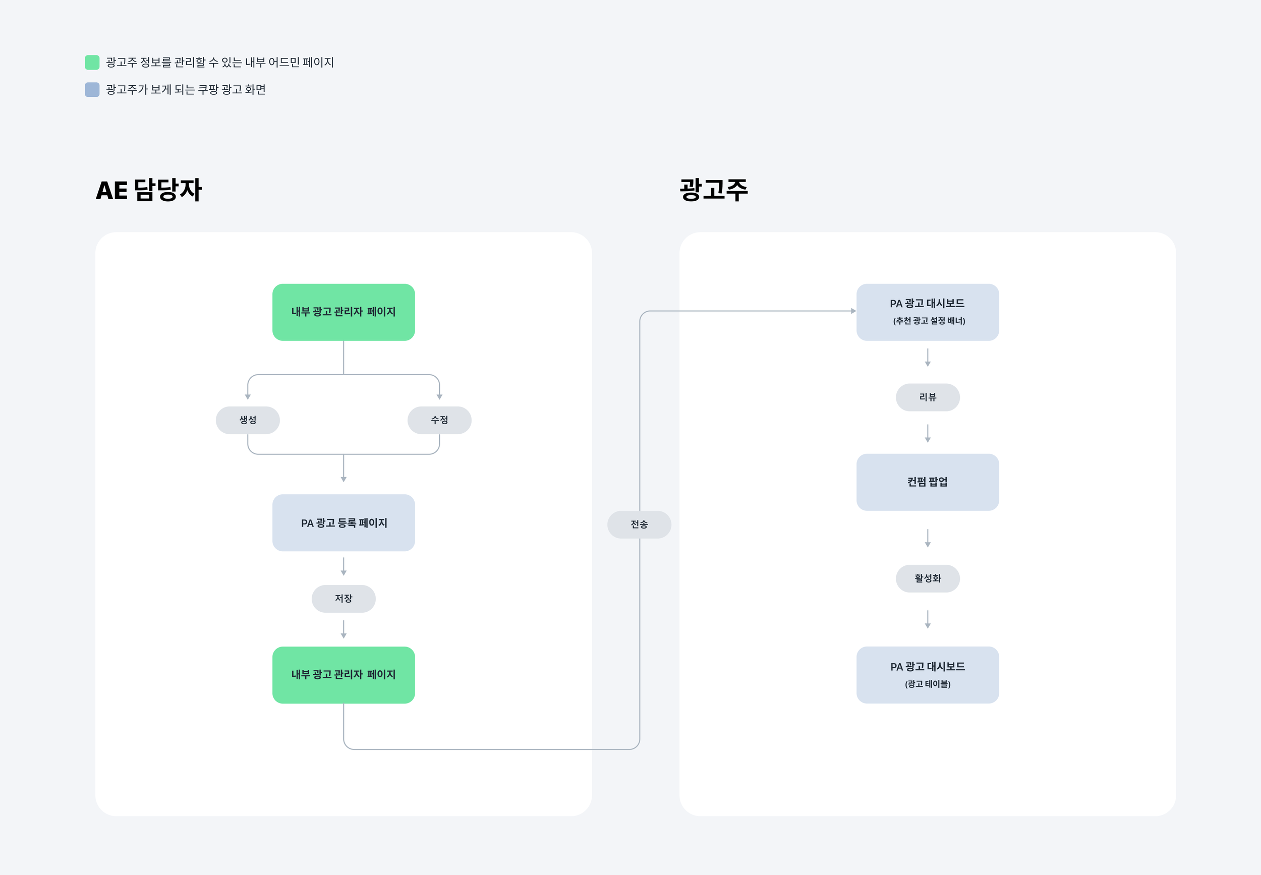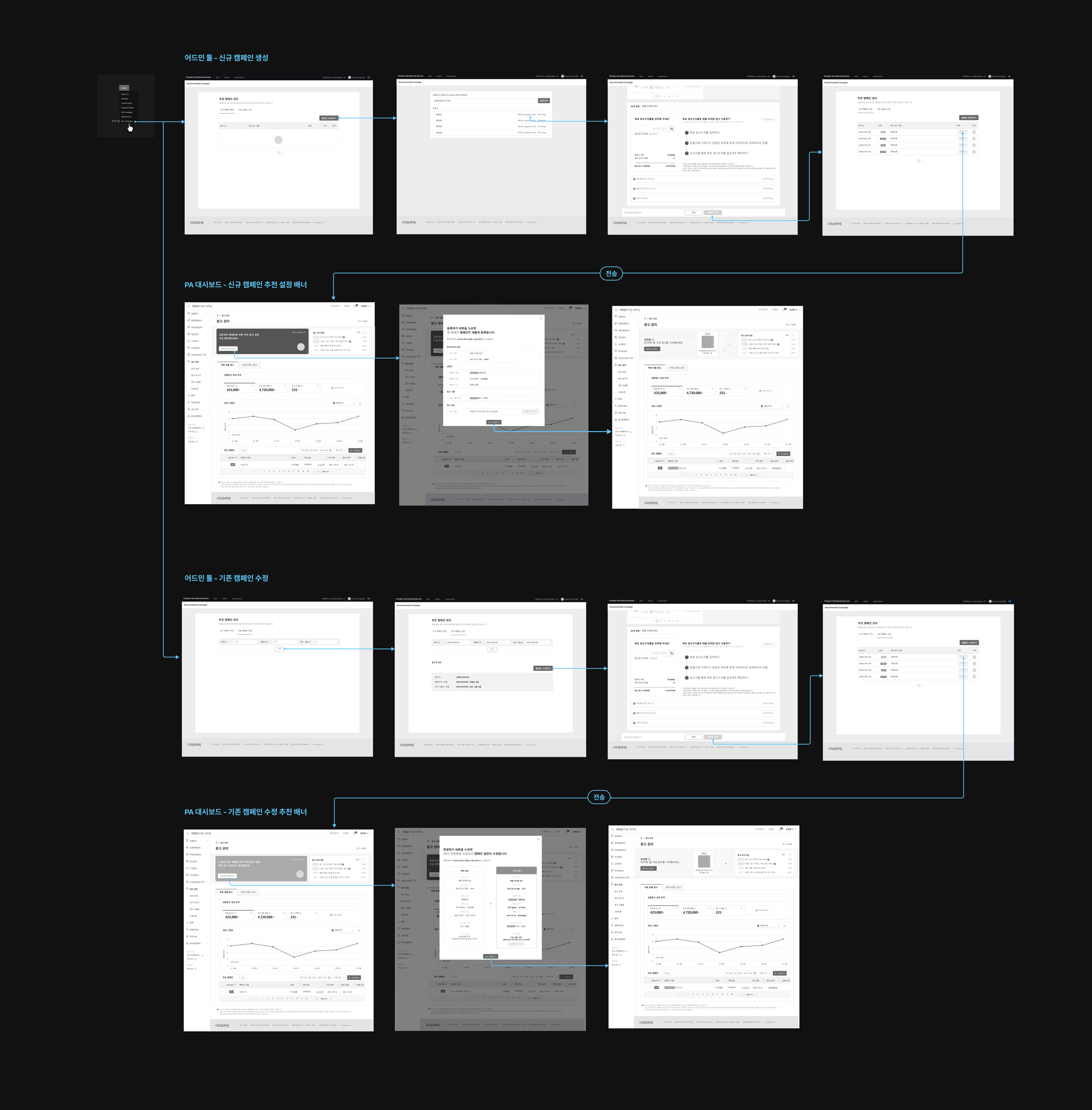 광고 담당자가 특정 페이지에서 어떤 일을 수행해야 하는지 정리하고 주요 기능을 파악 할 수 있도록 흐름을 그려 보았습니다.
