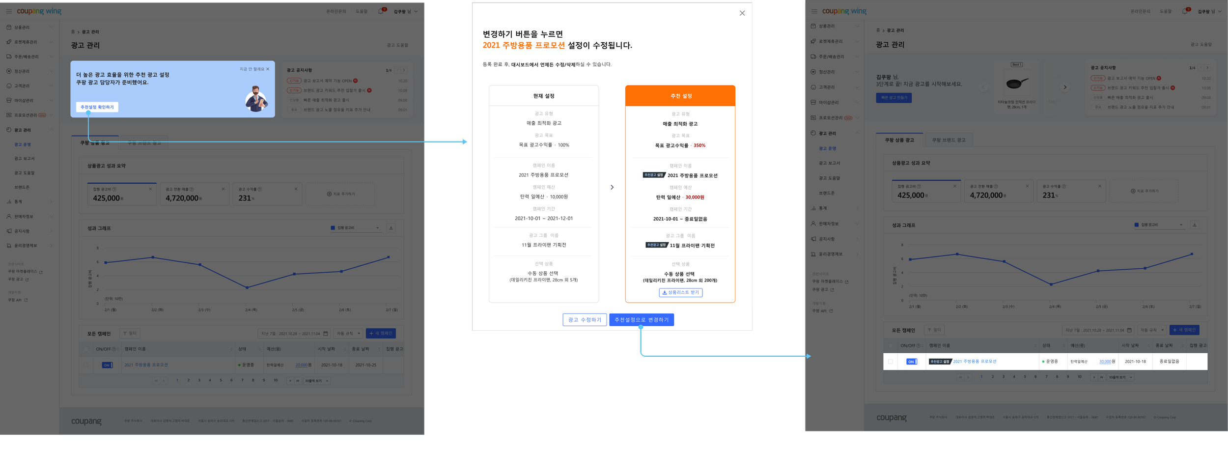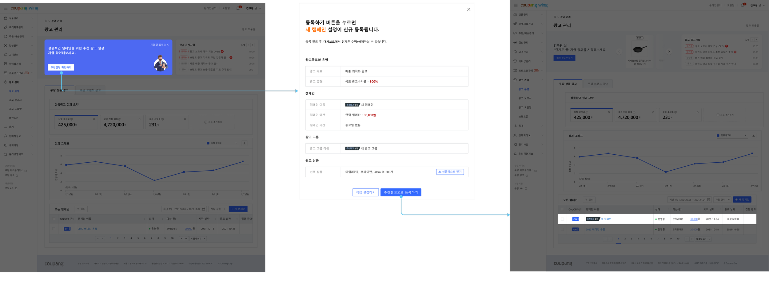 AE가 광고주의 니즈에 맞춰 상품, 예산, 기간, 목표 ROAS (투자한 광고비에 비례해 얼마나 매출을 얻었는지 가늠해 보는 지표로 광고 수익률(%)=전환 매출액/총비용 으로 계산) 를 미리 계산해서 광고주의 대시보드로 전송하면 별도의 조작 없이 간단한 과정으로 광고를 집행할 수 있는 기능을 만들었습니다. 이로써 신규 광고주가 빠르게 광고를 진행하고 매출을 만들어 낼 수 있도록 도왔습니다.