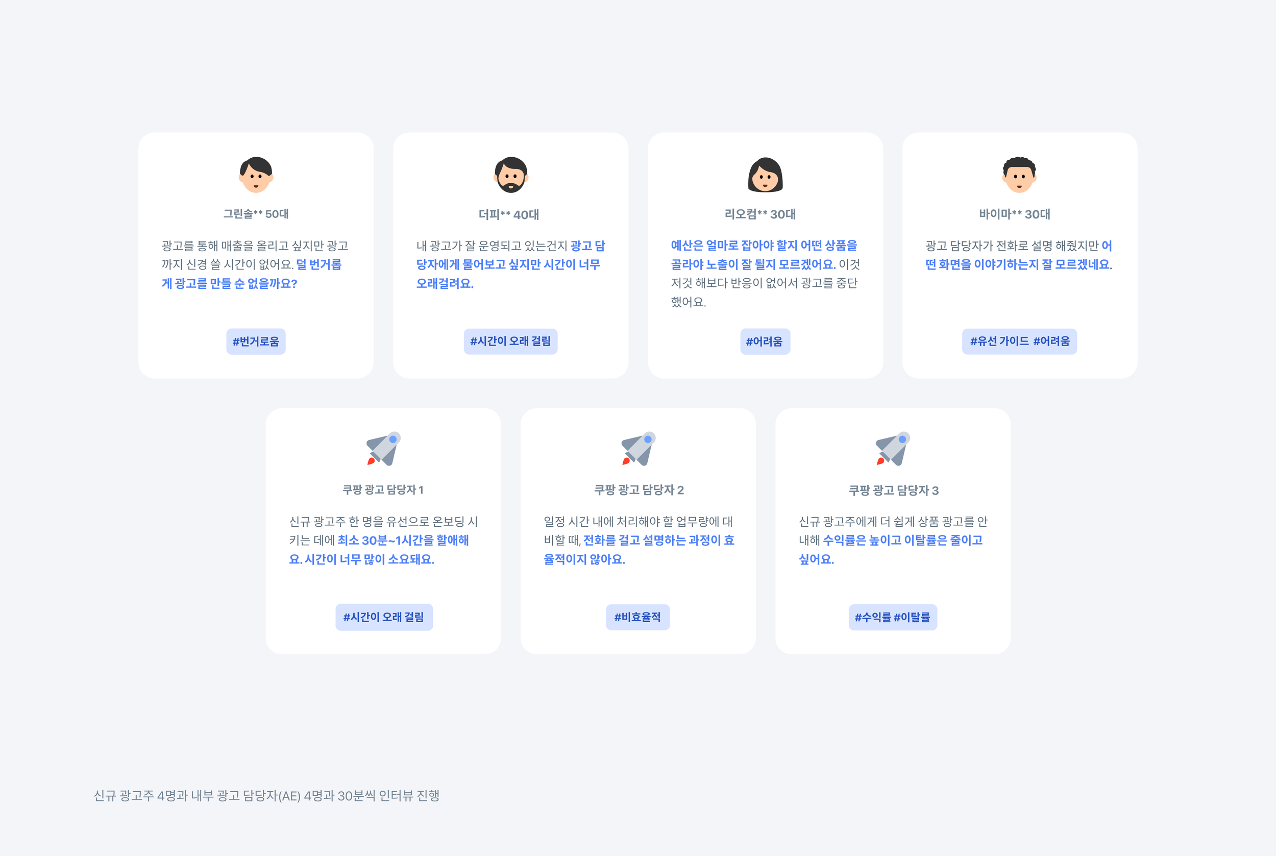신규 광고주(최근 한 달 안에 광고를 운영한 적이 없는 광고주)와 AE 내부 광고 관계자를 대상으로 심층 인터뷰를 진행하였고 아래와 같은 문제점이 있음을 확인할 수 있었습니다.